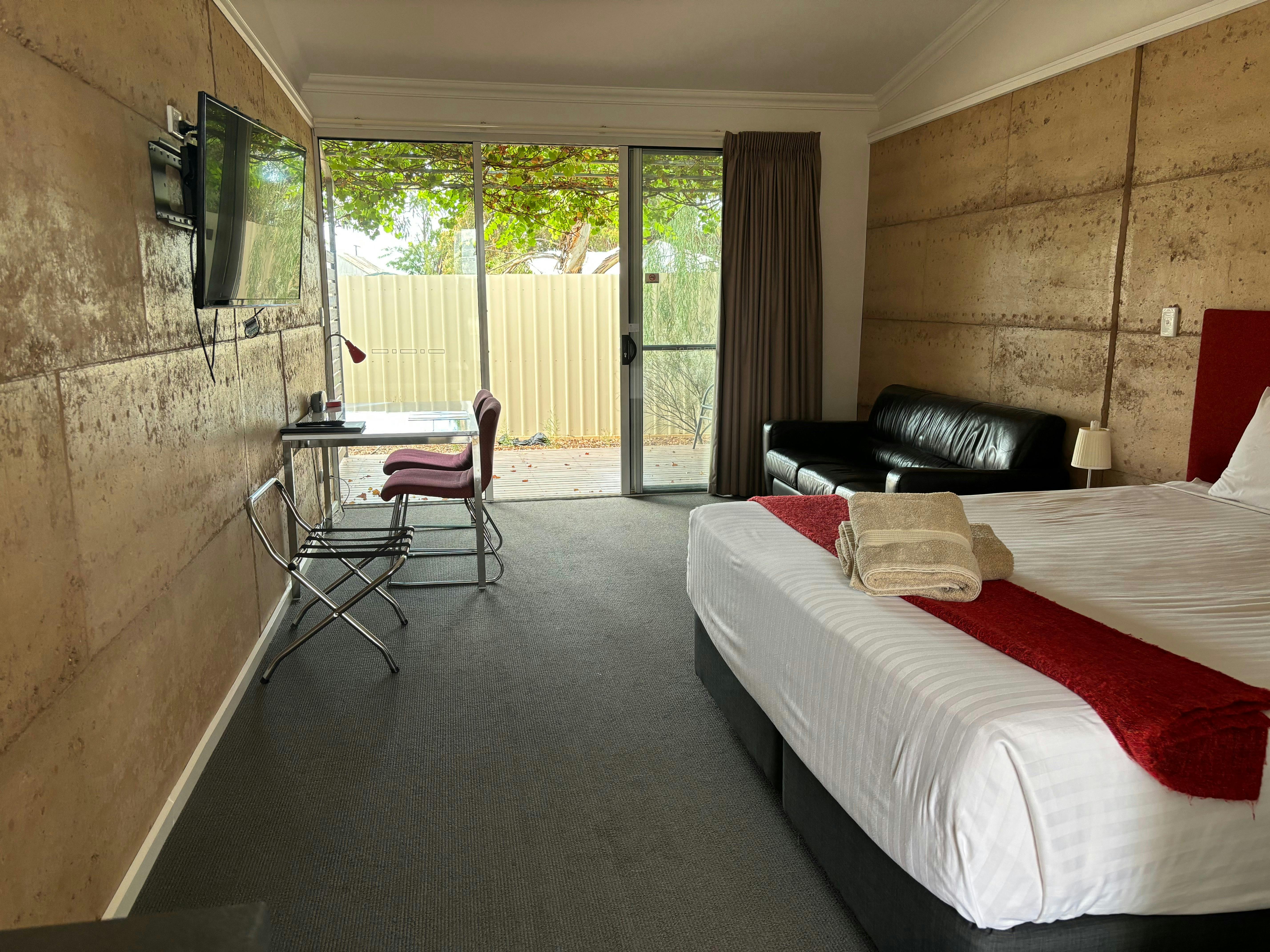The 22 studio style rooms feature modern ensuite bathrooms, King Beds, kitchenette with microwave, kitchen utensils, reverse cycle air conditioners, 65 inch smart TV and a leather sofa, desk and chair and outside table and chairs for drinks on the deck area.