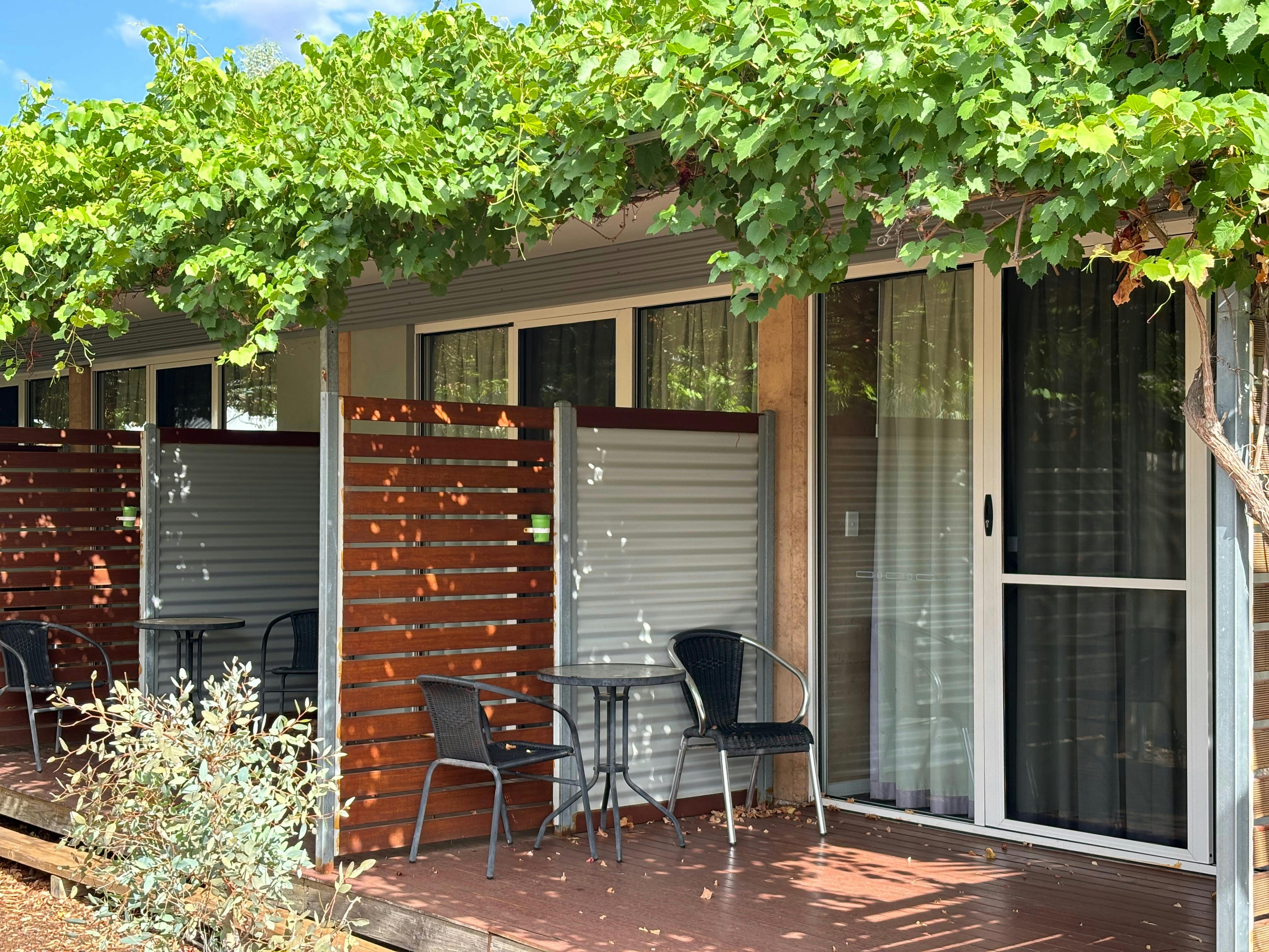 Built from environmentally sustainable products, the Crossroads Ecomotel combines rammed earth walls with a heavily insulated and airtight building envelope to keep the heat and noise out and comfort in. The 30 square meter rooms are well-appointed and have a large deck area (7m2) with double glazed sliding doors to allow the room to cross ventilate.
